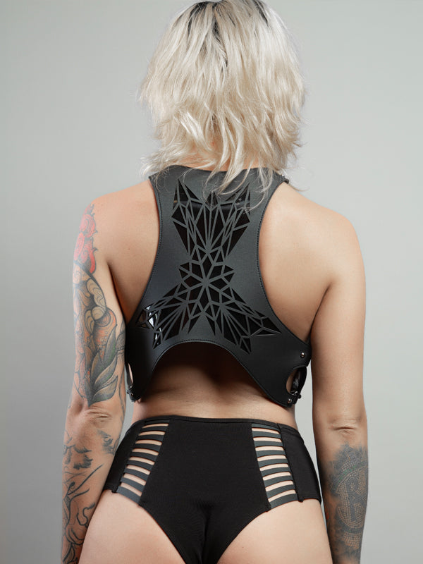 Auf der Rückseite ist alles kantig. Ein dickes, hochwertiges Kunstlederpanel – sorgfältig lasergeschnitten und perfekt verarbeitet – verleiht dem Look skulpturale Kraft. Kaum von echtem Leder zu unterscheiden, aber 100 % tierversuchsfrei, bildet es einen kraftvollen Kontrast zur weichen Vorderseite.
