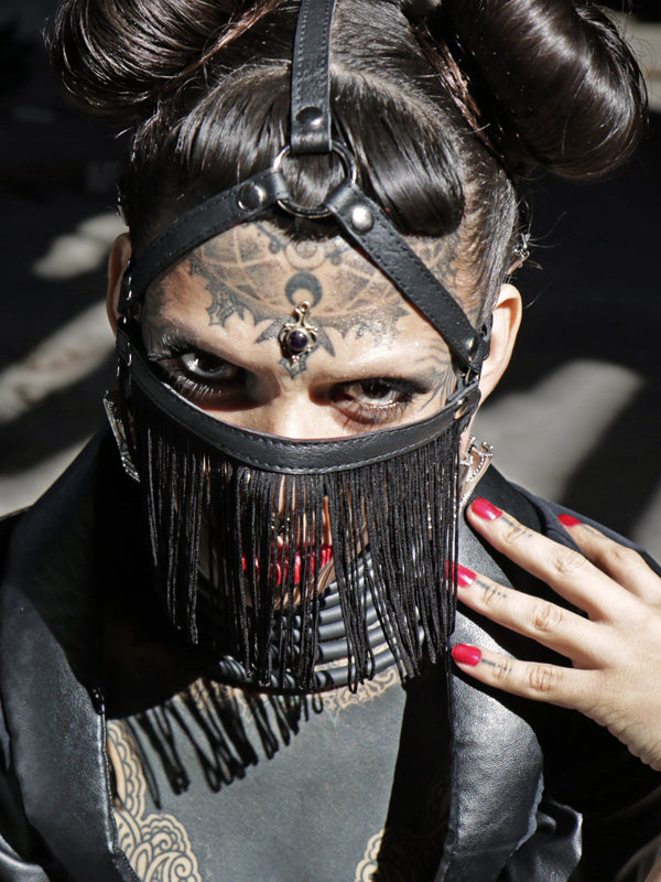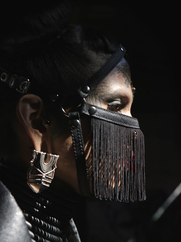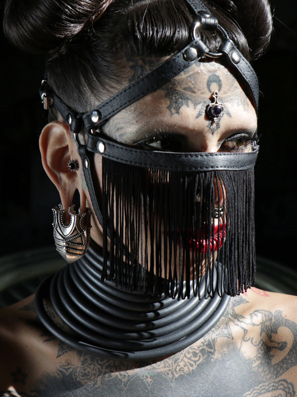 Dieses markante Harems-Kopfgeschirr vereint sinnliche Eleganz mit einem Hauch dystopischer Mystik. Es ist präzise gefertigt und verfügt über einen zarten Schleier, der sich vor den Mund legt und sowohl an alte Wüstenkönige als auch an avantgardistische Mode erinnert.