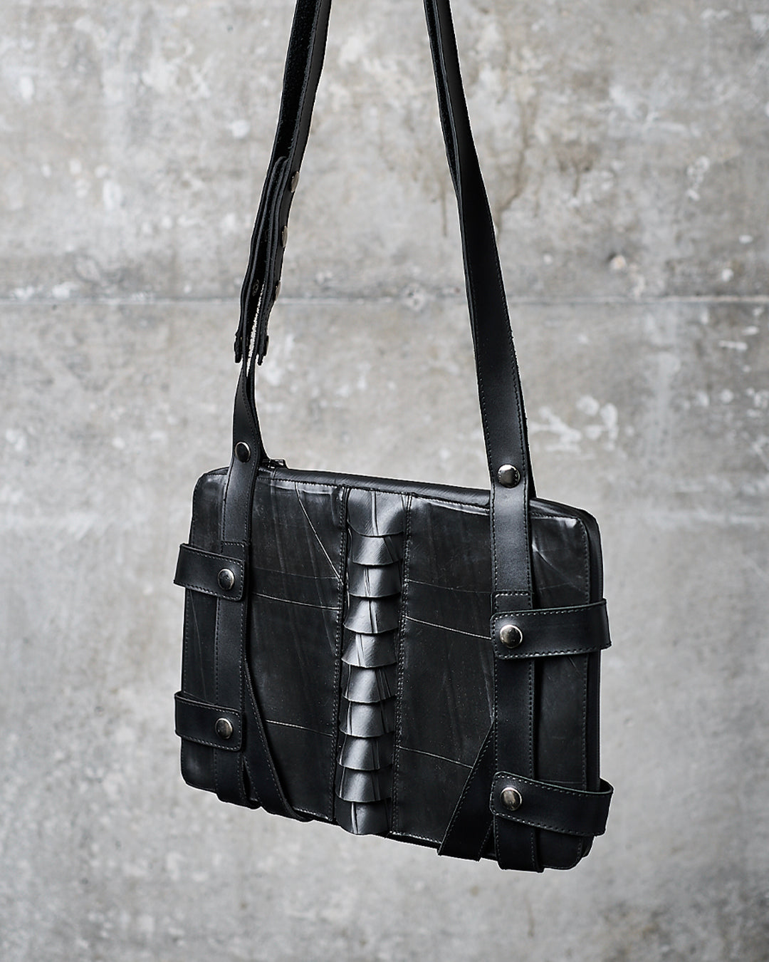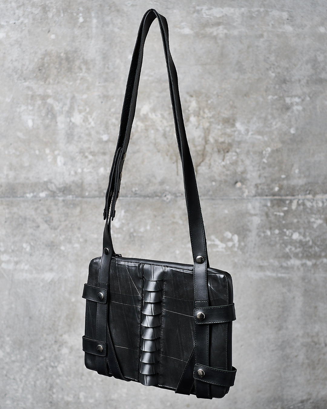 Die Tasche verfügt über einen verstellbaren Gurt aus Kunstleder , sodass Sie sie bequem über der Schulter tragen können, wohin Sie auch gehen – von der Straße ins Studio oder auf die Cyber-Tanzfläche.