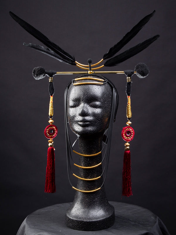 Das leichte Diadem ist bequem und lässt sich stundenlang tragen. Jeder Look wird zu einer visuellen Geschichte. Das Schmuckstück ist mit dramatischen, abnehmbaren Federn und zarten Quasten verziert, die von traditionellen nepalesischen Frauen getragen werden . Es verbindet kulturellen Einfluss mit einer modernen, ausdrucksstarken Ästhetik.