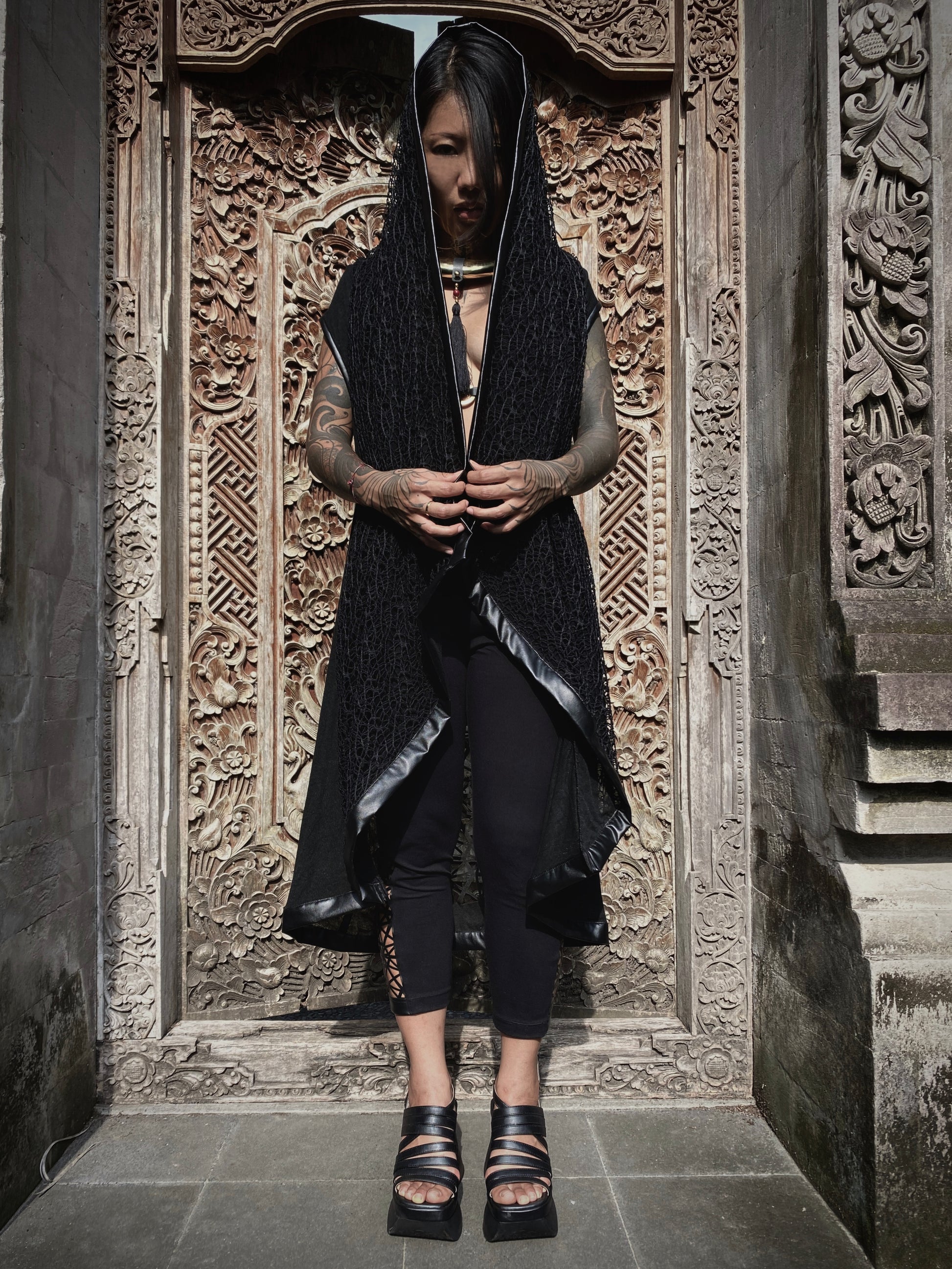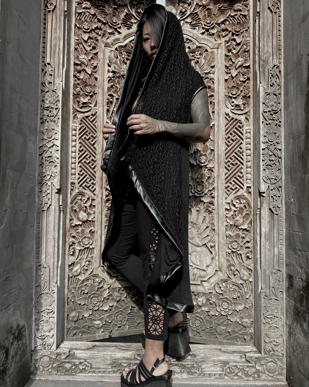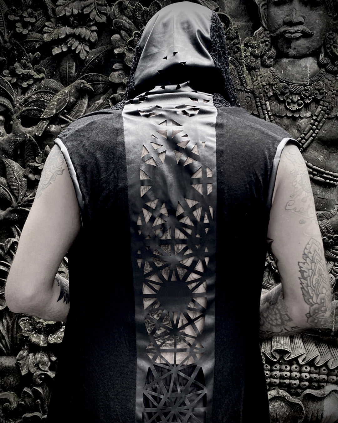 Unisex, layered, and unapologetically bold—the Bloodmoon Hoodie is built for those who thrive in the shadows. A laser-cut faux leather back panel ignites the piece with otherworldly texture, while the front fuses soft jersey and wide-mesh layers for a gritty, dimensional feel.