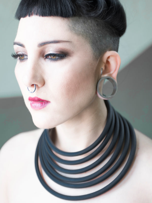 Crafted from flexible rubber tubes, this version features fewer rings for a more subtle look, while still keeping that bold, futuristic edge. Super lightweight and comfortable, it’s perfect for layering or as a standalone statement.